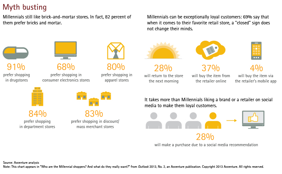 The chart below shows statistics about the way Millennials shop. Although Millennials tend to be exceptionally digitally-savvy (especially when it comes to social media), studies show they still like to shop in retail/brick-and-more stores. Millennials use the internet to research and review price, products, value, and service and have shown to have an impact on how their parents shop.