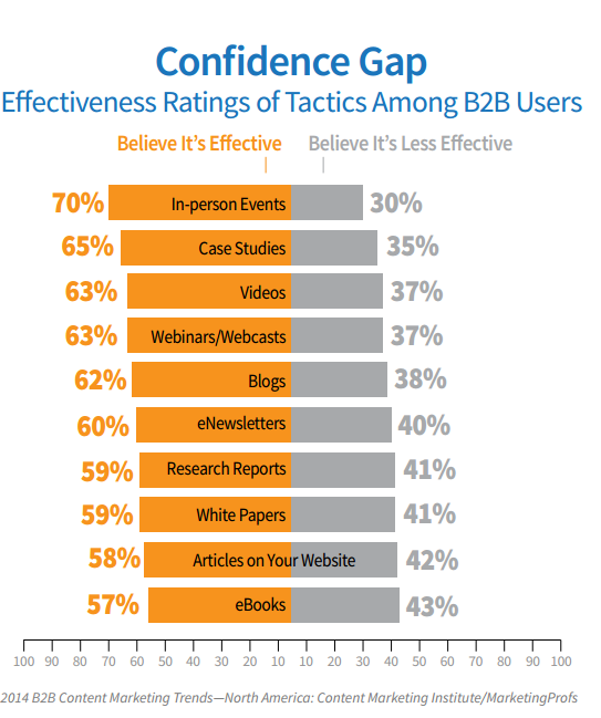 Content Marketing Institute's 2014 Report for B2B content marketers indicates that B2B content marketers still view in-person events as their most effective tactic. The seamless transition of content from online marketing channels (via social media conversations, PPC and display ads, and content on the site via case studies and videos) to in-person conversations and consumer experience will only grow in importance.
