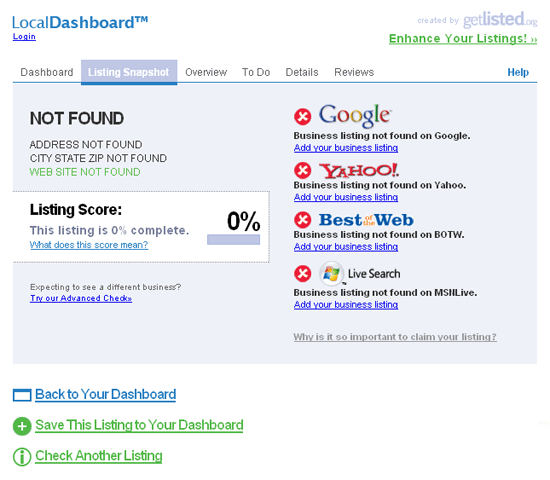 Keeping with SEOmoz, our listing snapshot revealed that we have claimed a listing in Google but not in any of the other locations.