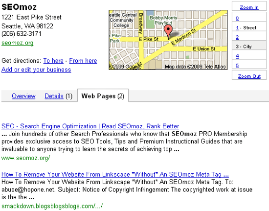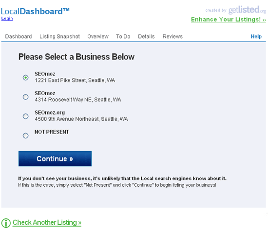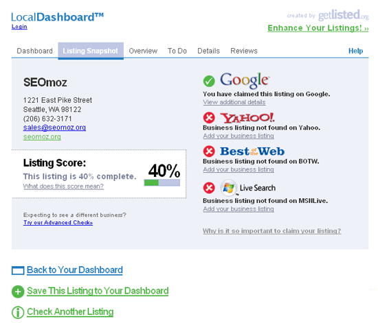Going back to the dashboard, the "Try our Advanced Check" link pulled up multiple listings for SEOmoz, one for each of our old business addresses (we've moved twice since I've been employed).