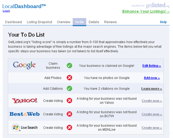 Some other nice touches on Get Listed include ways to rank higher in the local search engines and a great resource center that features lots of local search marketing advice, information and tips. The site also displays recent local search engine reviews for your business, but I didn't have any for TN Multisports or for SEOmoz, so that's something I definitely want to play with in the future.
