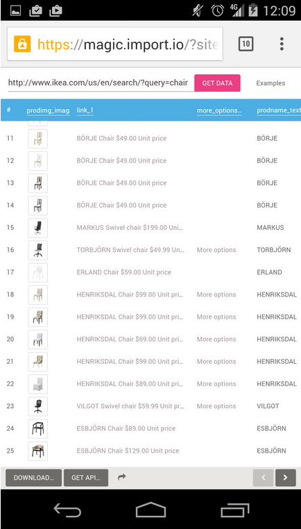 Here’s what happens when you extract data from Ikea.com using import.io Magic on mobile. You can see it has all the data I might need on there, including pictures, links, price, and title:
