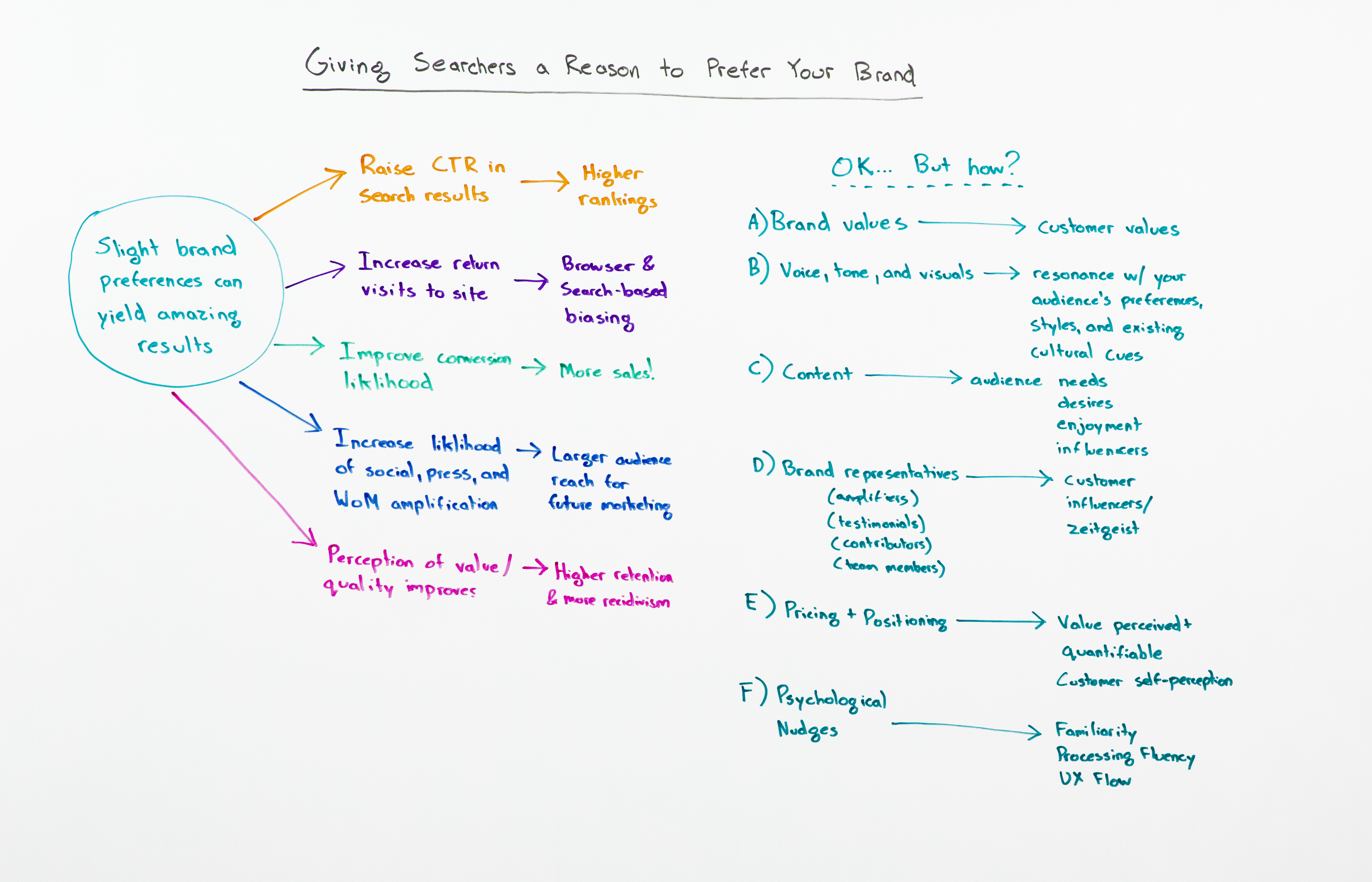 First off, it'll raise your average click-through rate in search results. As a searcher is performing whatever queries they are, the hopefully many thousands of queries that lead to your site, if you appear in position four, five, or six, you might see a slightly higher click-through rate than what you would normally see for an average website ranking in that position because of the brand preference. What this does, actually, is over time it results in higher rankings because Google is set up to reward a long-term click-through rate bump and all the other signals that come with that into higher rankingSo even if you are someone who says, "Ah, I'm not really sure whether Google's using click-through rate models in my stuff," they are in a lot of stuff now. Even if you don't believe that, what's happening is you're getting a slightly higher share of visits, which means a slightly higher share of people who can amplify your brand, link to your brand, all those kinds of things. All of those signals over time slowly, positively increase your potential ranking.
