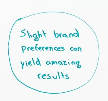 Even small brand preferences can yield these sort of remarkable and amazing results because of the amplification that they receive all the way down the line in your marketing effort. Let's say, for example, that you are able to get a slight lift in brand recognition, in brand affinity, in recall, and in positive associations. It's going to do a few things for you.