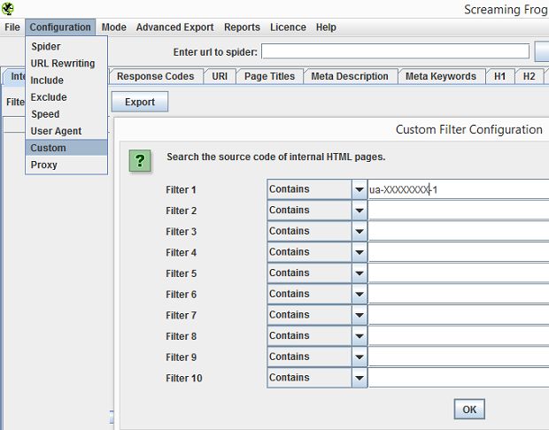 - To check this more thoroughly, fire up Screaming Frog and update the custom field to check for the proper UA ID