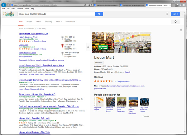 Screenshot of Google Local Search Results for "liquor store boulder Colorado":