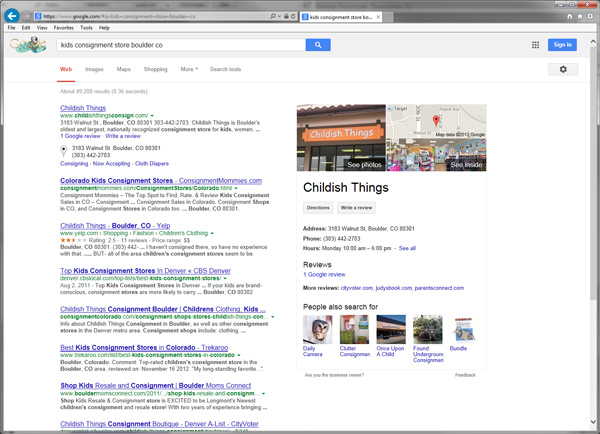 For this keyword set, Google delivered just a single local result -- even though it is not the only kids consignment store in Boulder, Colorado.