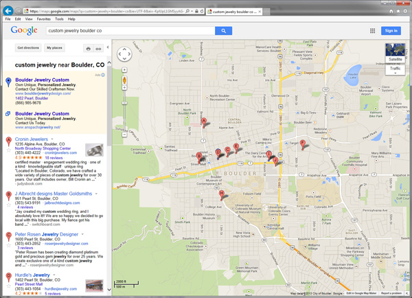 Boulder has a lot of non-chain stores, and jewelry is no exception. Custom crafted pieces can command top prices, so ranking well means more customers coming into the store.