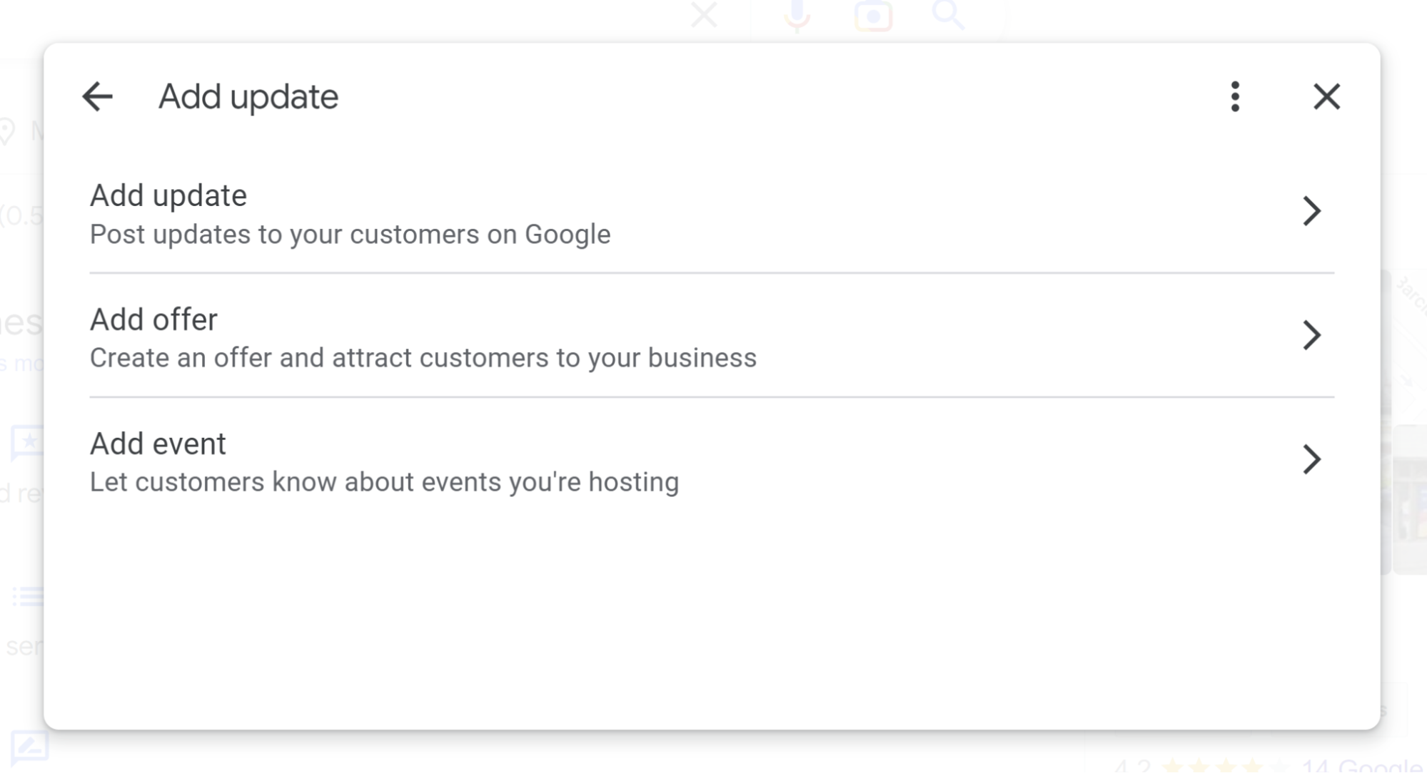 Click the “add update” link in the NMX and you’ll be shown three types of posts you can write: updates, offers, and events. The first lets you add an image, a description, and a linked button and will stay live for six months before being archived. The second includes all these fields, plus a date range setting for the period in which your offer is live, and additional informational fields to further explain the terms of your offer. The third type includes fields for information like when your event starts and ends. Some listings may also feature discontinued post types.