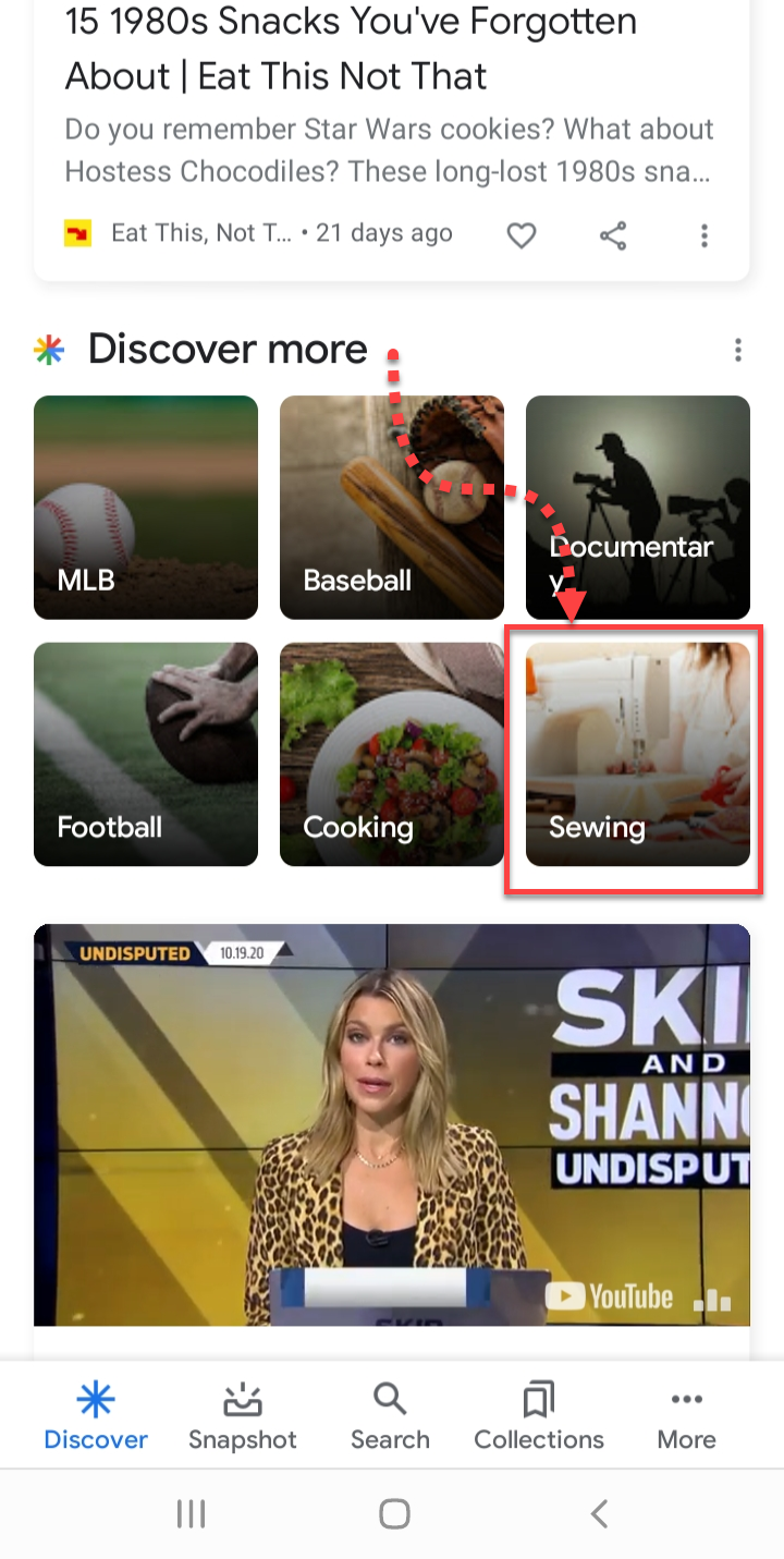 Watching YouTube videos (desktop) about sewing was only successful in getting Google to include the topic in its “Discover more” cards.