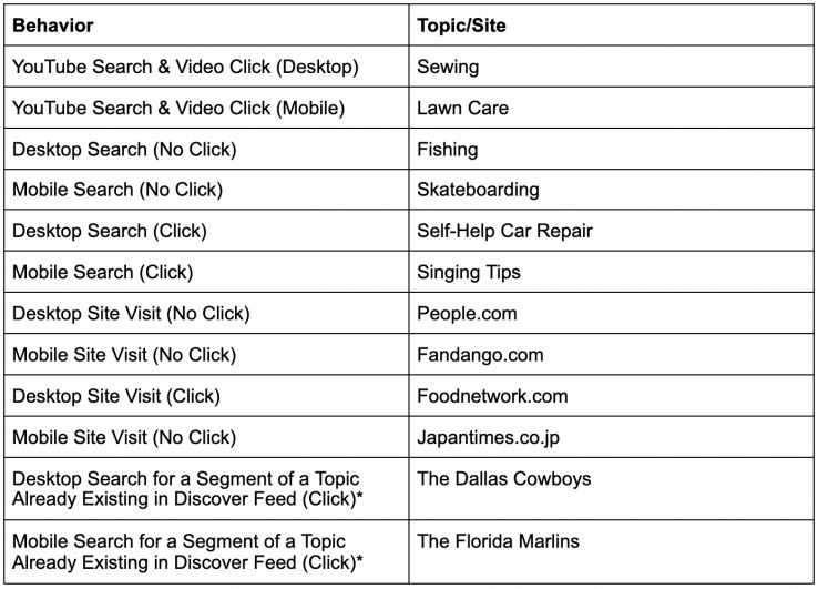 Here’s a breakdown of the various behaviors I executed along with the topics associated with each behavior. (For the record, each behavior corresponds to a single topic or website so I could determine the impact of that behavior on my Discover Feed.)