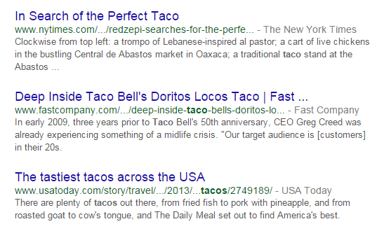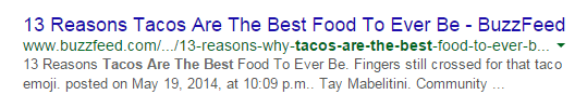 They're the things we spend all of our time chasing. A simple organic result, if such a thing even exists these days, has a linked title (in blue), a destination URL (in green), and a "snippet" of descriptive text.