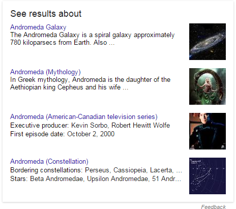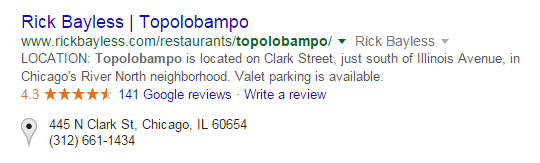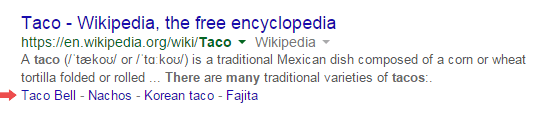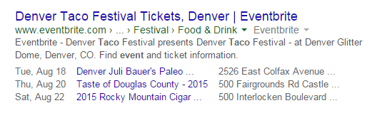 Similarly, pages about events may show rich snippets that link to specific dates and locations. These appear as individual rows below the snippet, and may show additional data.