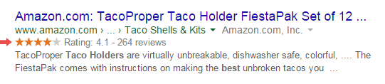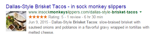 Review stars and rating data are sometimes displayed for products, recipes, and other relevant items. Review/rating data is shown between the destination URL and snippet.