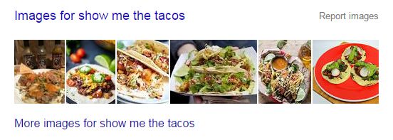 Image results are displayed as a horizontal row of image links, which click through to a Google Images search. Image results may appear in any organic position.