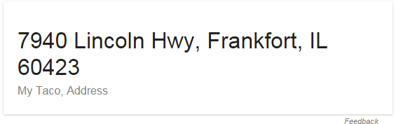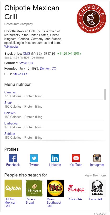 Restaurant menus for specific locations may be shown in a specialized, card-like format. These generally list the name of the restaurant, the address, and tabbed categories that allow you to scroll through a text-based menu.