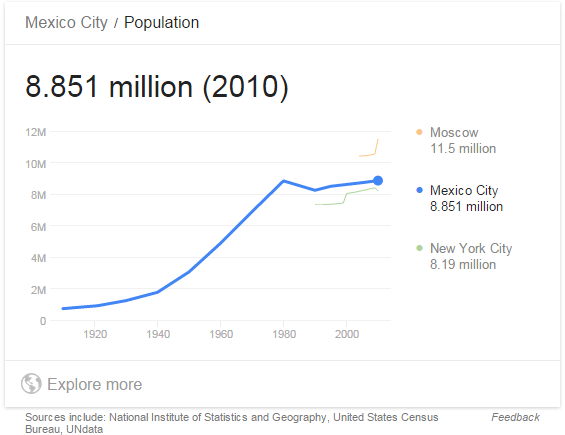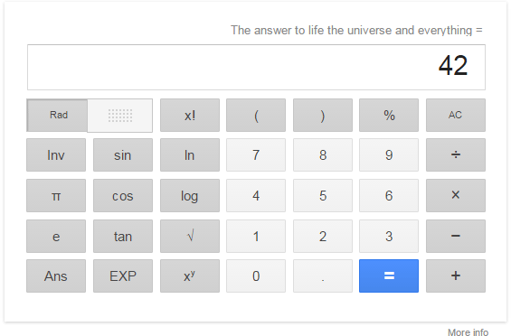 Google also includes a fully-featured scientific calculator, that can be triggered by simple formulas, such as "7 X 6" or "sqrt(1764)". The example below is a Google Easter Egg. Some formulas, such as "sin x" will launch a graph card instead.