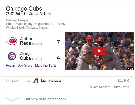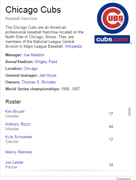 Previously available in carousel format for narrow searches (like "Chicago Cubs roster), team rosters were added to Knowledge Panels for professional sports franchises. Rosters appear as a scrolling window.