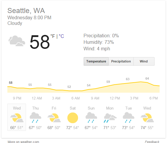 Another common Live Result is regional weather forecasts. This is another very rich feature that includes current conditions, a short-term forecast, a long-term forecast, and even some interactive features in the UI.