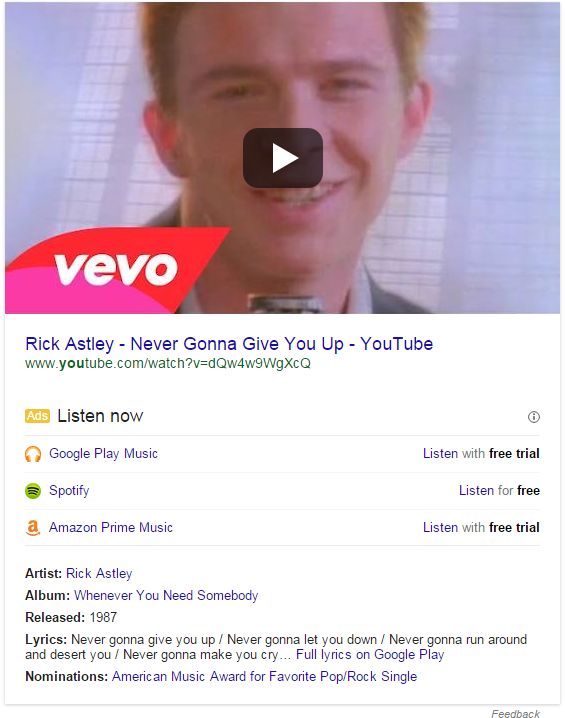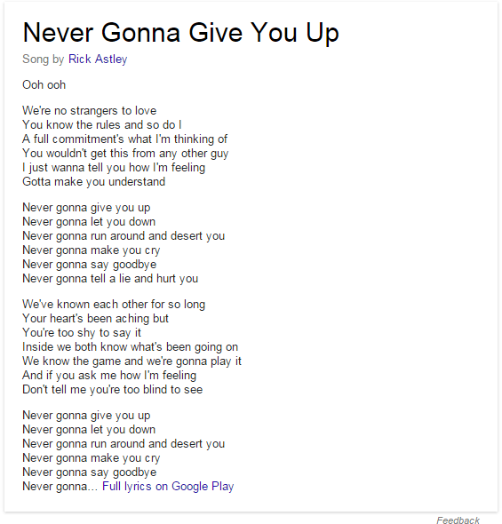 In the first half of 2015, Google started to display song lyrics directly in a card-like format. Lyrics are taken directly from Google Play and link to Google Play for more information and the option to purchase the song.