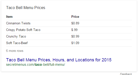As Featured Snippets expand, they are also becoming more richly formatted, including images, lists, and tables. The example below shows a Featured Snippet made up of tabular data.