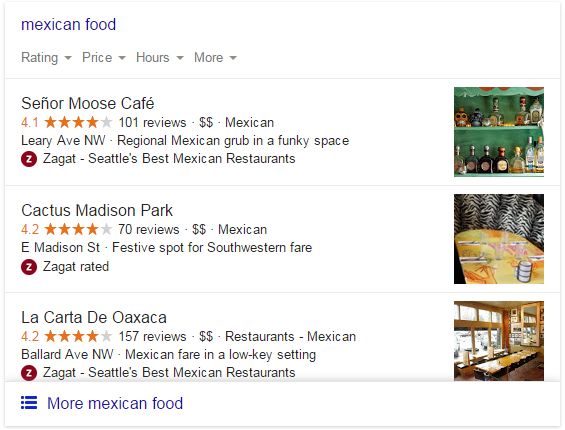 Before re-launching local packs, Google rolled out the "snack pack", a specialized local 3-pack with search filters, and no direct website link. These packs are still being used in some niches, including general restaurant searches.