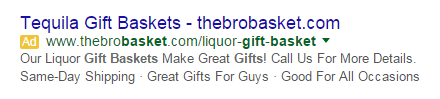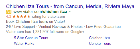 Traditional ads can have many different extensions and enhancements, just like organic results. The example below has review stars, Google+ follower count, and mini-sitelinks. Ads may also qualify for full sitelinks.