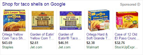 Paid Shopping results or Product Listing Ads (PLAs) sell products directly with rich information, such as images and pricing. Paid Shopping results in the left column usually appear as a horizontal row of products.