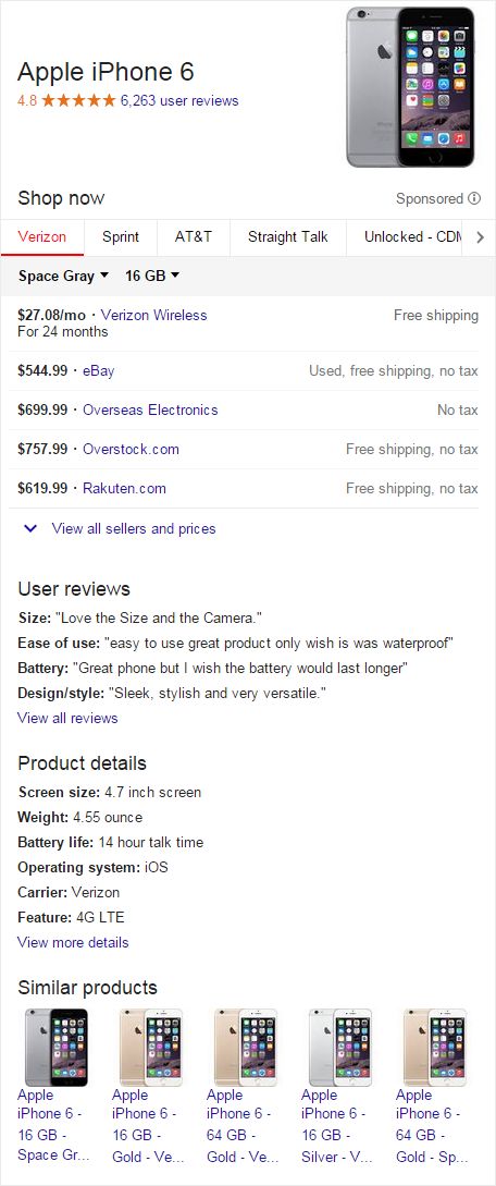 Unique product models may trigger a specialized entity that looks like a Knowledge Panel but is actually a sponsored result. The example below is from a smartphone search, which shows retailers and the option to filter by carrier.