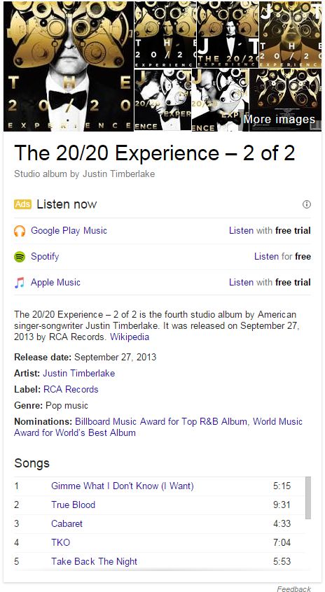 Similarly, Knowledge Panels for musical artists and album titles may give you paid listings to listen to songs online. Recently, some books have added "Read now" ads as well. Expect this type of paid feature to expand.