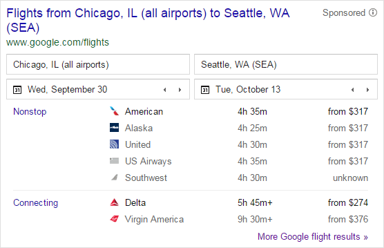 Flight searches can trigger a number of paid features. The example below is a card-like format that allows you to check and book flights directly via the Google Flights engine.