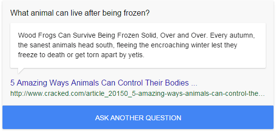 Type "I'm feeling curious" into Google, and you'll get a card-like feature with a random trivia question. Like Featured Snippets, these factoids come from indexed pages and include attribution.