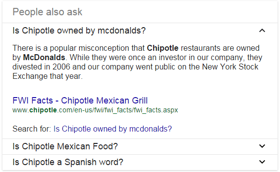 The Related Questions card shows algorithmically-generated questions that Google believes might relate to your search. Each question expands to something that looks like a Featured Snippet. Related Questions are mixed into organic results and their location may vary.