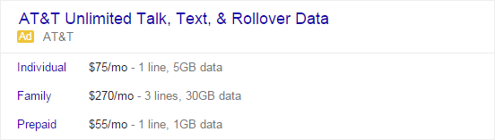 Google seems to be testing a unique ad unit with mobile plan information and pricing. This example was captured for AT&T, but it's likely this option is in testing across multiple carriers.