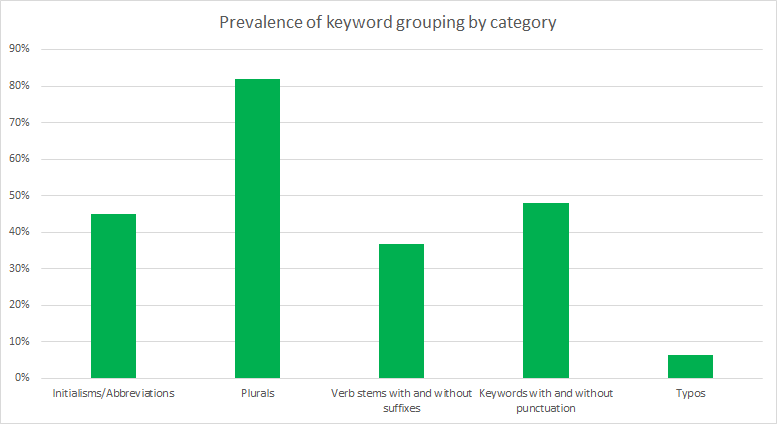 - The prevalence of keyword grouping is highest for plurals, and very low for typos