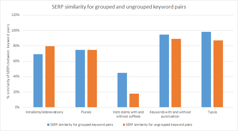 In the case of Typos, there are no grouped keyword pairs at all that have identical SERPs. Given also the low prevalence of grouped keywords in this category, it appears that the identical SERPs are coming from "showing results for" SERPs, where Google replaces results for the mistyped keywords with the correct one.