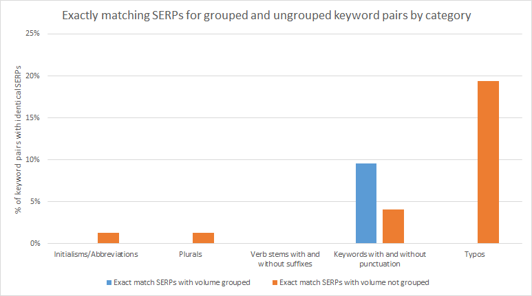 I also looked at how common it is that SERPs are exactly identical, that is that the top ten results are the same pages, in the same order. This showed an interesting pattern. There are only two categories with significant numbers of identical SERPs—Punctuation and Typos. In the case of keywords with and without punctuation, you are more likely to see identical SERPs (implying that Google sees the pair of keywords as identical) if keyword volumes are grouped than if they are not. This is not a hard-and-fast rule though – there are still some ungrouped keywords which have identical SERPs.