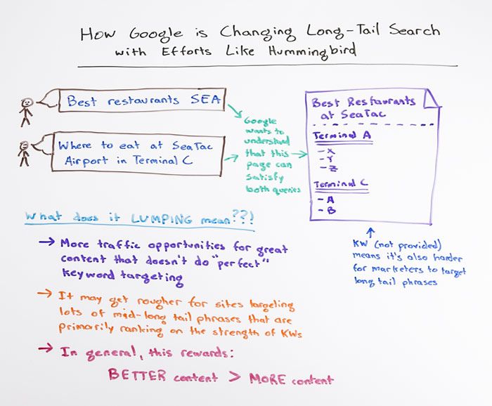 The Hummingbird update was different from the major algorithm updates like Penguin and Panda, revising core aspects of how Google understands what it finds on the pages it crawls. In today's Whiteboard Friday, Rand explains what effect that has on long-tail searches, and how those continue to evolve.