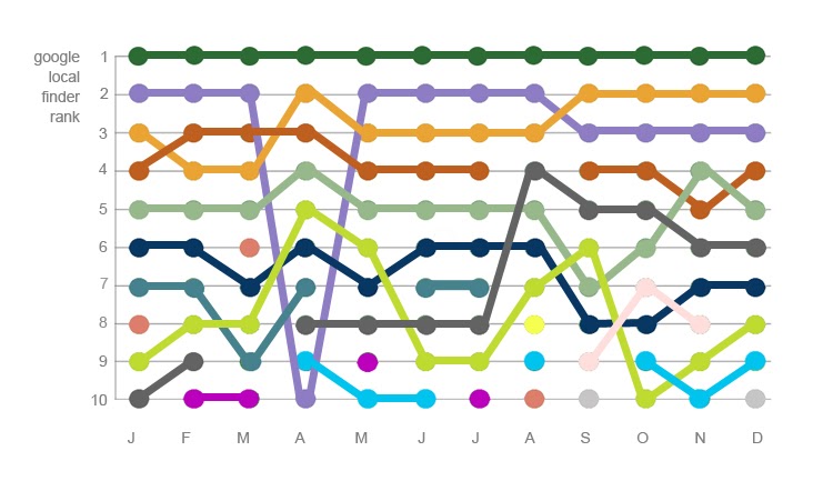 Google’s local finder results are paginated in sets of ten. In the following chart, you’ll see the top 10 competitors as they stood in January, moved throughout the year, and finished in December. A total of fifteen brands saw some visibility in the top 10 local finder results over the course of the year, and each brand is represented by its own color.