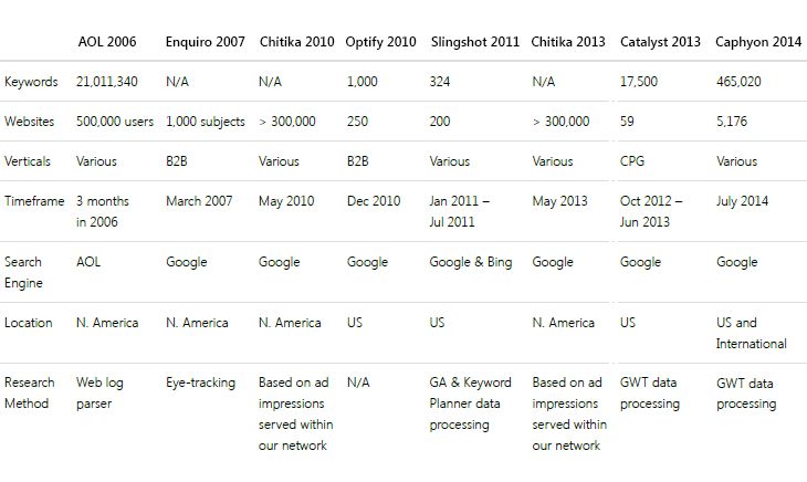 A number of studies followed after that, including those from Enquiro (now Mediative) in 2007 and later by Chitika and Optify in 2010. More recent studies have been performed by Slingshot in 2011 and then Chitika and Catalyst in 2013 respectively.