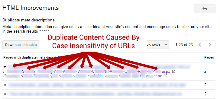 Of the many useful features in GSC, Google provides a list of some common HTML errors it discovered in the course of crawling your site. This section, located at Search Appearance > HTML Improvements, lists off several potential errors including Duplicate Titles, Duplicate Descriptions, and other actionable recommendations. Fortunately, this first example gives us an opportunity to outline methods for testing both the internal and external validity of the data. As you can see in the screenshot below, GSC has found duplicate meta descriptions because a website has case insensitive URLs and no canonical tag or redirect to fix it. Essentially, you can reach the page from either /Page.aspx or /page.aspx, and this is apparent as Googlebot had found the URL both with and without capitalization. Let's test Google's recommendation to see if it is externally and internally valid.