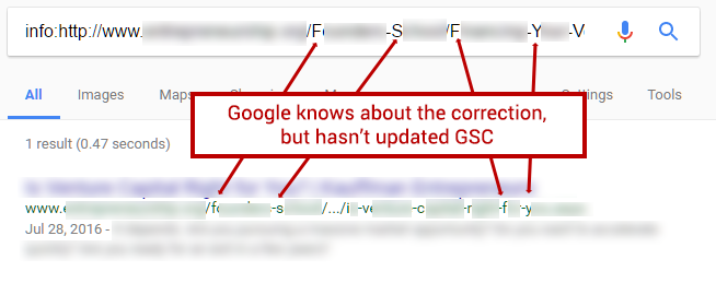 By executing an info:http://concerning-url query in Google with upper-case letters, we can determine some information about what Google knows about the URL. Google returns results for the lower-case version of the URL! This indicates that Google both knows about the 301 redirect correcting the problem and has corrected it in their search index. As you can imagine, this presents us with quite a problem. HTML Improvement recommendations in GSC not only may not reflect changes you made to your site, it might not even reflect corrections Google is already aware of. Given this difference, it almost always makes sense to crawl your site for these types of issues in addition to using GSC.
