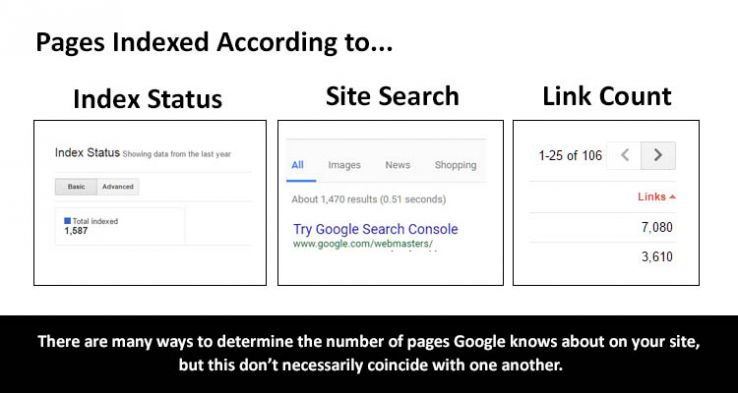 We found the link count method to be difficult to use, though. Consider the graphic above. The site in question has 1,587 pages indexed according to GSC, but the home page to that site has 7,080 internal links. This seems highly unrealistic, as we were unable to find a single page, much less the majority of pages, with 4 or more links back to the home page. However, given the consistency with the site: command and GSC's Index Status, I believe this is more of a problem with the way internal links are represented than with the Index Status metric.