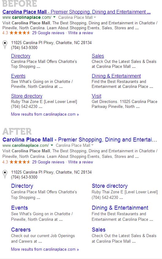 Here's a #1 result with expanded site-links. The query is [carolina place mall]: