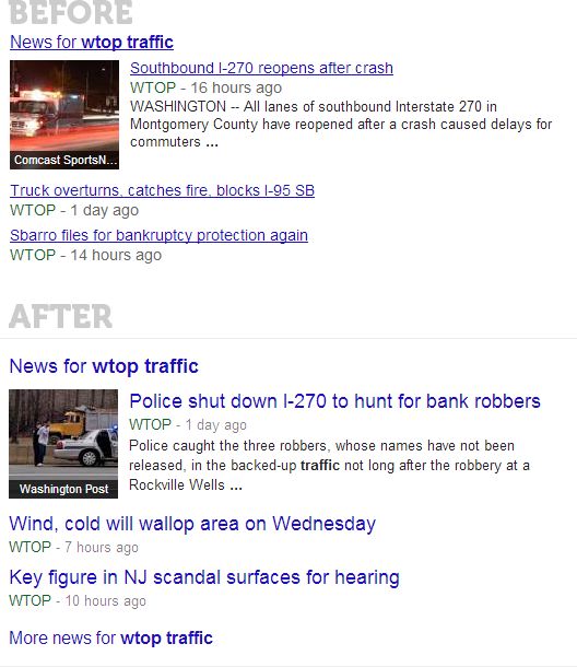 Here's a query for [wtop traffic], showing the redesigned news vertical results. Note that these were captured on different days, so the actual articles have changed—the count/layout are equivalent, though: