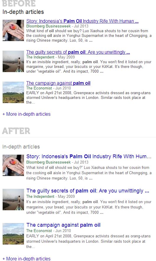 Here's a look at Google's newest vertical, in-depth articles. The query is [palm oil]: