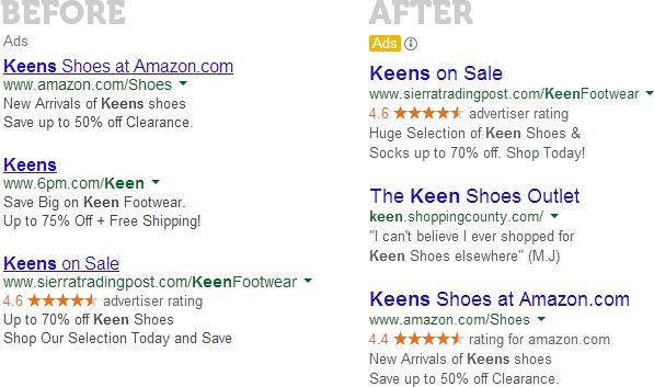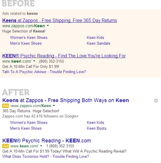 In addition to the larger, non-underlined titles and horizontal divider, the colored background is gone, and a yellow [Ad] box appears next to each individual ad. The "Ads related to…" text has been removed as well.