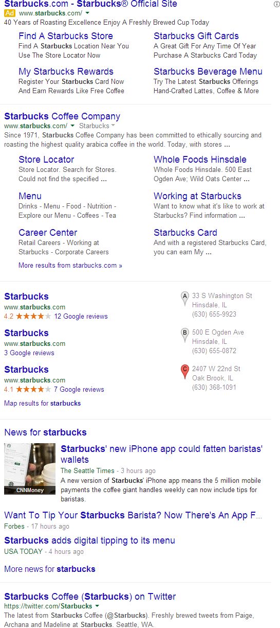 To see this idea in action, here's a local (Chicago suburbs) search for [starbucks]. Notice how the dividers separate the expanded top ad, the expanded #1 result, a local 3-pack, a news box, and, finally, the rest of the organic results:
