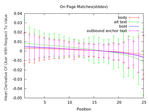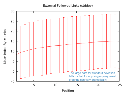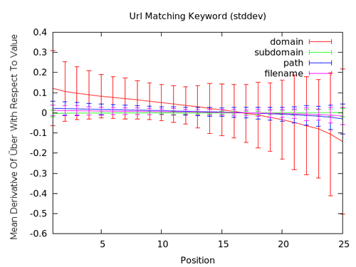 In this next chart, we can see the standard deviation error bars. You can see that we're more confident that in the top results, employing keywords in these URL features won't hurt and is likely to help, while in the latter portion of the results, we've got a bit less confidence about the negative effects.