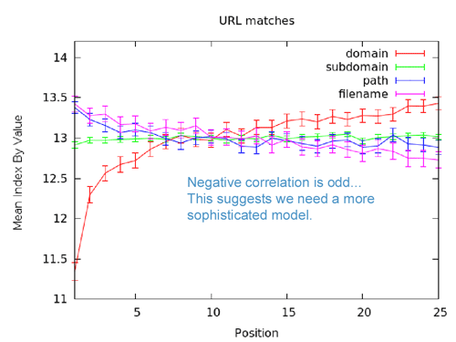 As you can see, this model suggests that, once again, subdomains are largely useless places to put keywords, but the root domain is a very good place to employ it. Path and filename are slightly positive, which also fits with our expectations. It's also important to note that on this chart some lines dip below 0 on the "mean derivative of uber" y-axis in the 20-25 ranking position range. This suggests that for those results, the keyword use may actually be hurting them. Looking into some sample results, we can see that a number of the URLs in that 20-25 range seem to be trying too hard. They're using the keyword multiple times in the domain/path/filename and fit with what many SEOs call "spammy-looking." It could certainly be a weakness in our model's accuracy, but we think it's also likely that a lot of pages would actually benefit from being a bit less aggressive with their URL keyword stuffing.